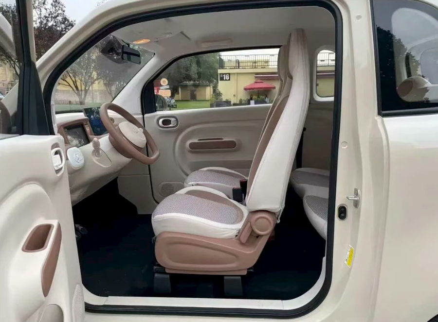 车身侧面,新车的奶咖棕配色在外后视镜壳、B柱以及轮圈盖等位置,同样采用了撞色设计,与前脸的设计形成呼应,让整车侧面看起来更有层次感,避免了微型车常见的 “单调感”。同时,新车将配备12英寸轮圈,与车身尺寸比例协调,既保证了视觉上的和谐。车身尺寸方面,新车长宽高分别为 3000/1510/1630毫米,轴距为1953毫米。