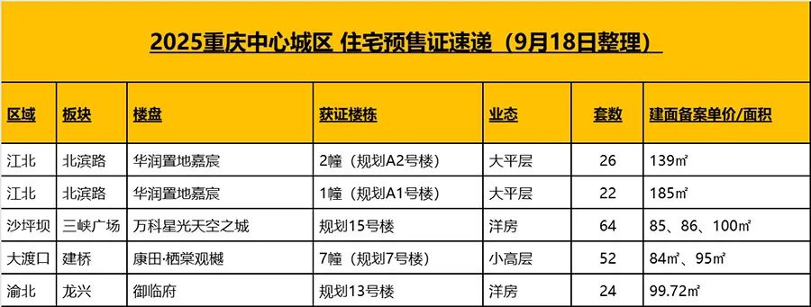 房天下数据监控中心统计显示,重庆共有4个楼盘公示了最新预售证,188套房源上新。位于北滨路一线的华润置地嘉宸,1幢、2幢共48套四代宅产品上新。