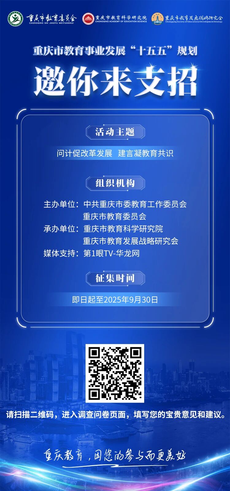 市委教育工委、市教委决定面向社会各界和广大人民群众,开展“我为重庆市教育发展‘十五五’规划建言”主题征集活动。