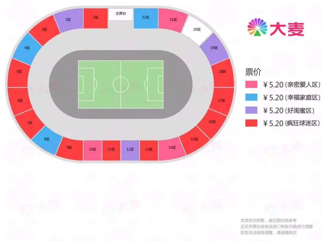 本次比赛门票在大麦网站售卖,座位特别设置了四个区域,包括亲密爱人区、幸福家庭区、好闺蜜区、疯狂球迷区,市民可以根据自己的喜好,选择想要观赛的区域。